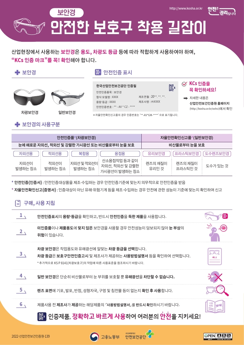 산업용 보안경 안전인증제품의 올바른 착용 및 사용방법 안내 - 보안경 종류 - 안전인증 표시 - 보안경의 사용구분 - 구매, 사용 지침 등